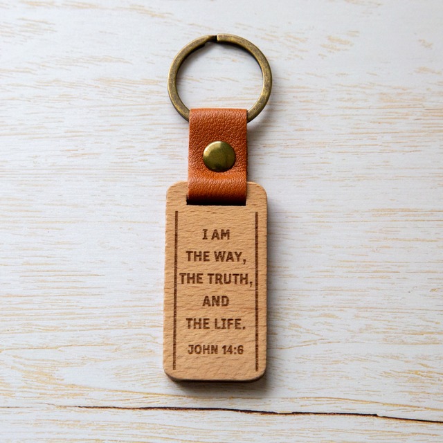 ウッドとレザーを組み合わせたキーホルダーのウッド部分に、ヨハネ14:6の英語訳と道をモチーフにした線をレーザー彫刻で刻印しました。 木とリングの繋ぎ目に合皮を使用しています。木の親しみやすさと合皮の上品さが合わさって、年齢・性別を問わずどなたでもお使いいただけます。 鍵にはもちろん、普段お使いのカバンやポーチなどに手軽にお付けいただけます。 お使いいただくことで、みことばを心に留めるきっかけとなれば嬉しいです。 ※彫刻は片面のみで裏面は無地です。 ※1点ずつ制作していますので、微妙な位置や色合いの違いなど、仕上がりに多少の個体差が出ることがあります。 ※木を使用した商品ですので、模様や色合いに個体差があります。 ※ご覧いただいている画面やお部屋の照明などによっては、写真と実物の見え方が異なる場合があります。 サイズ:全長約9.3cm(本体部分:約4.7cm、レザー・リング部分:約4.5cm)