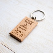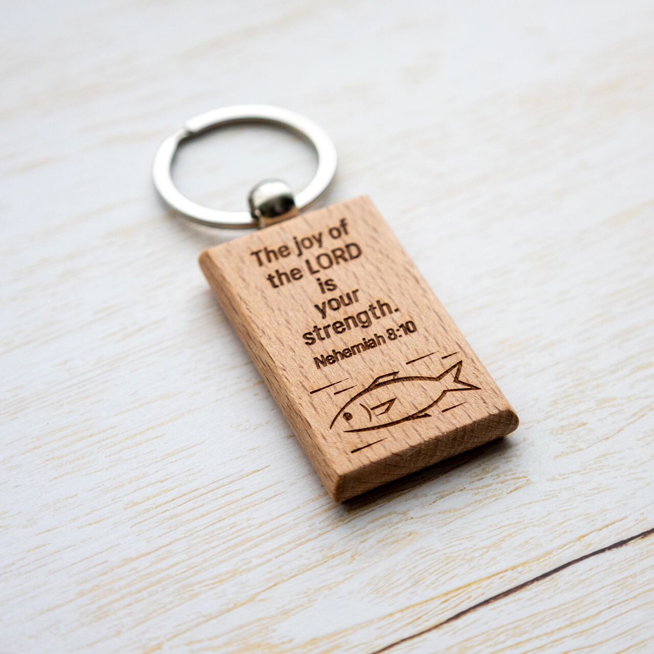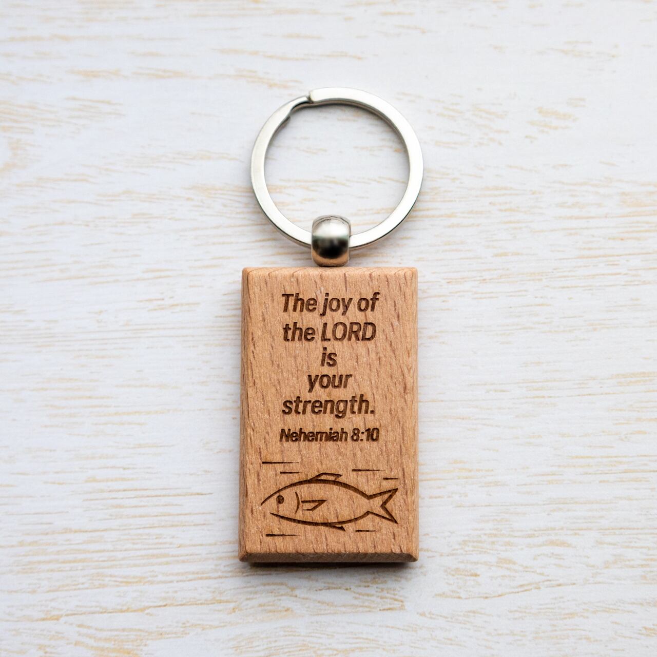 長方形の木製キーホルダーに、ネヘミヤ記8:10の英語訳と魚のイラストをレーザー彫刻で刻印しました。
