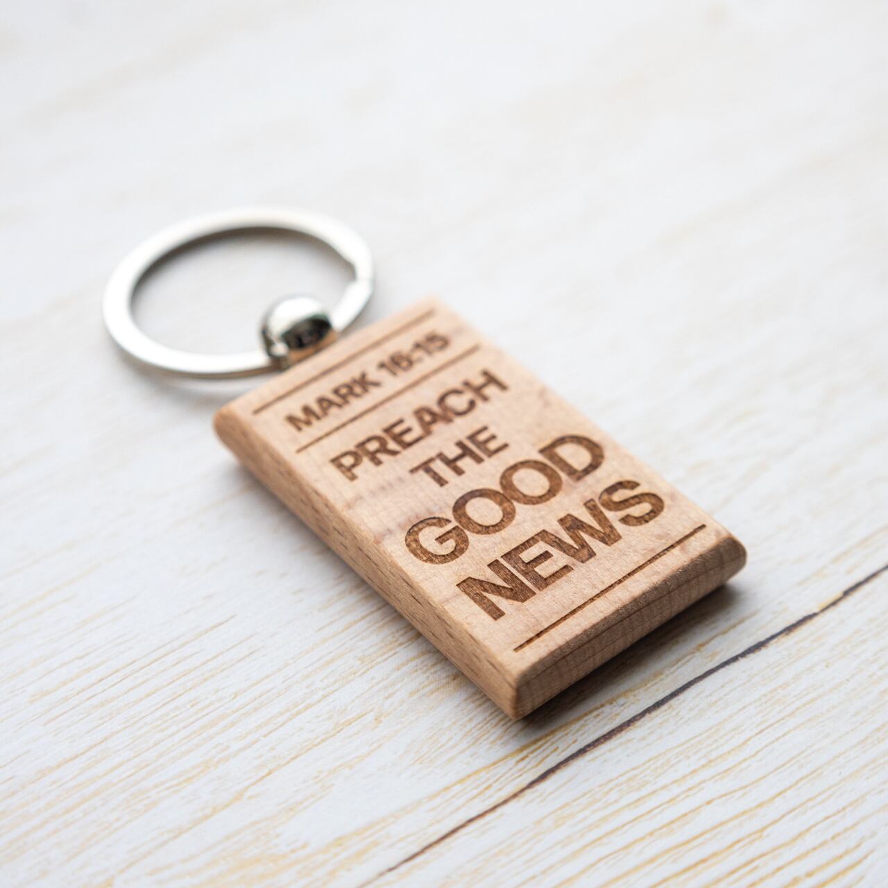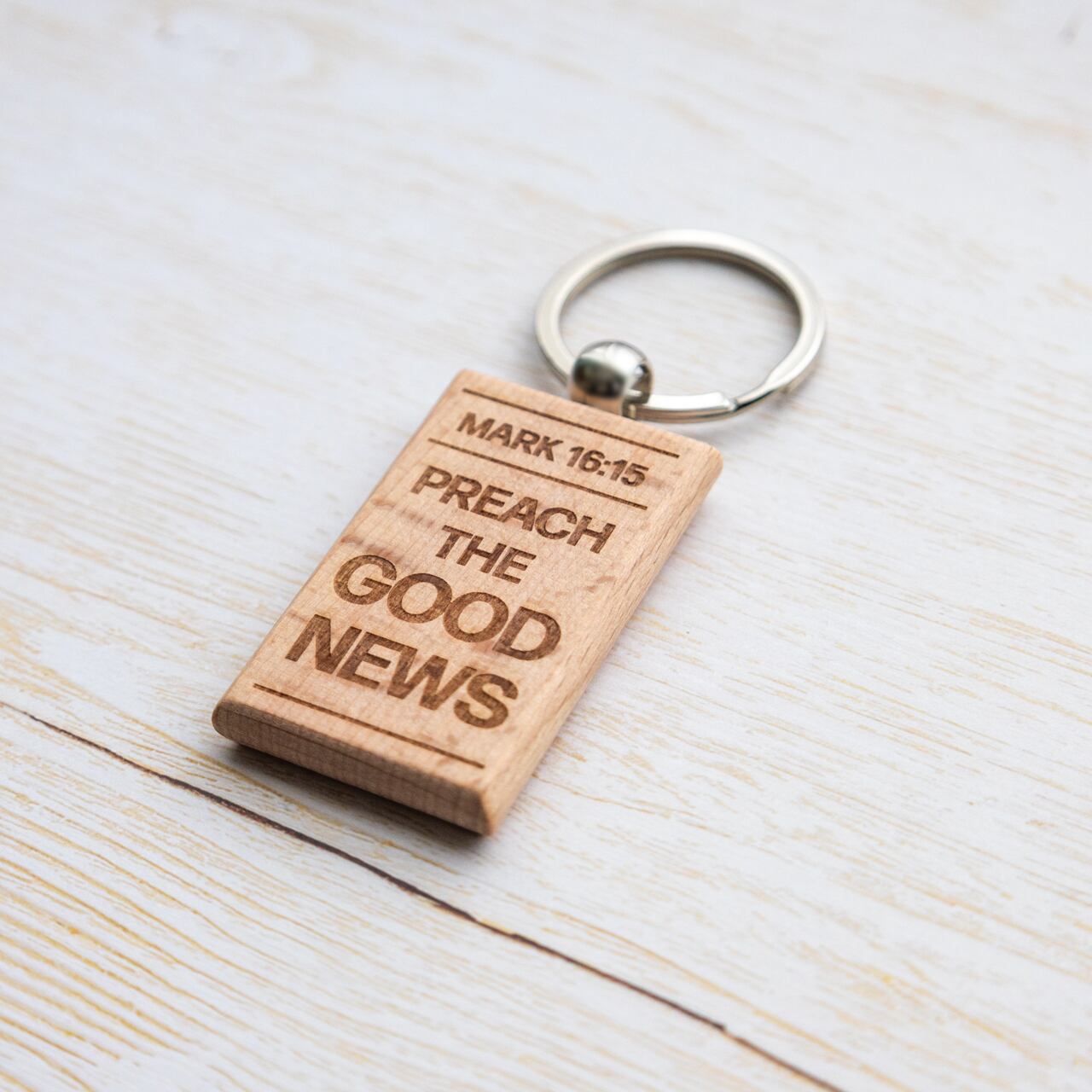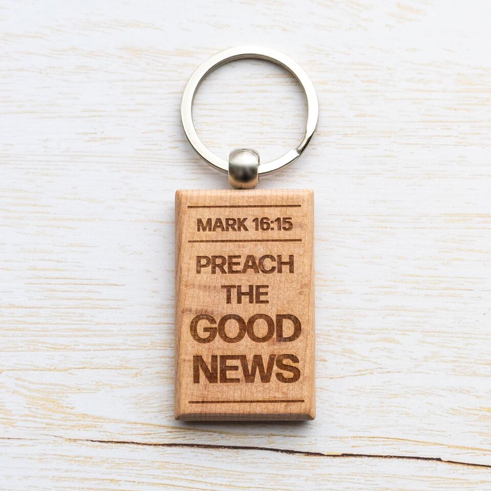 長方形の木製キーホルダーに、マルコ16:15の英語訳をレーザー彫刻で刻印しました。