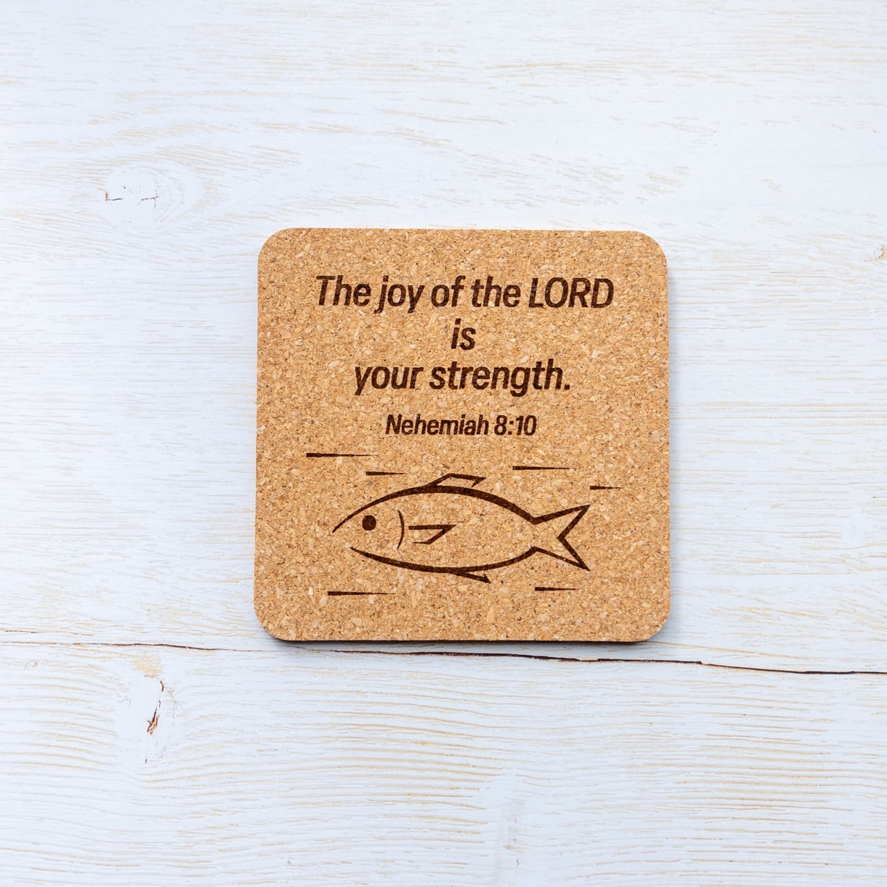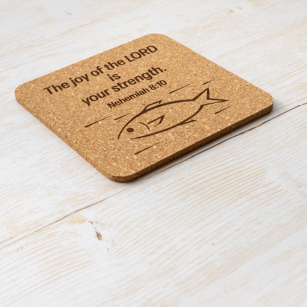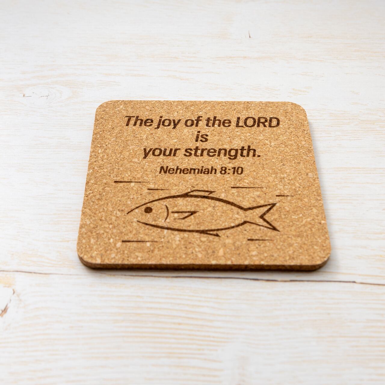 正方形のコルクコースターに、ネヘミヤ8:10の英語訳と魚のイラストをレーザーで彫刻しました。
