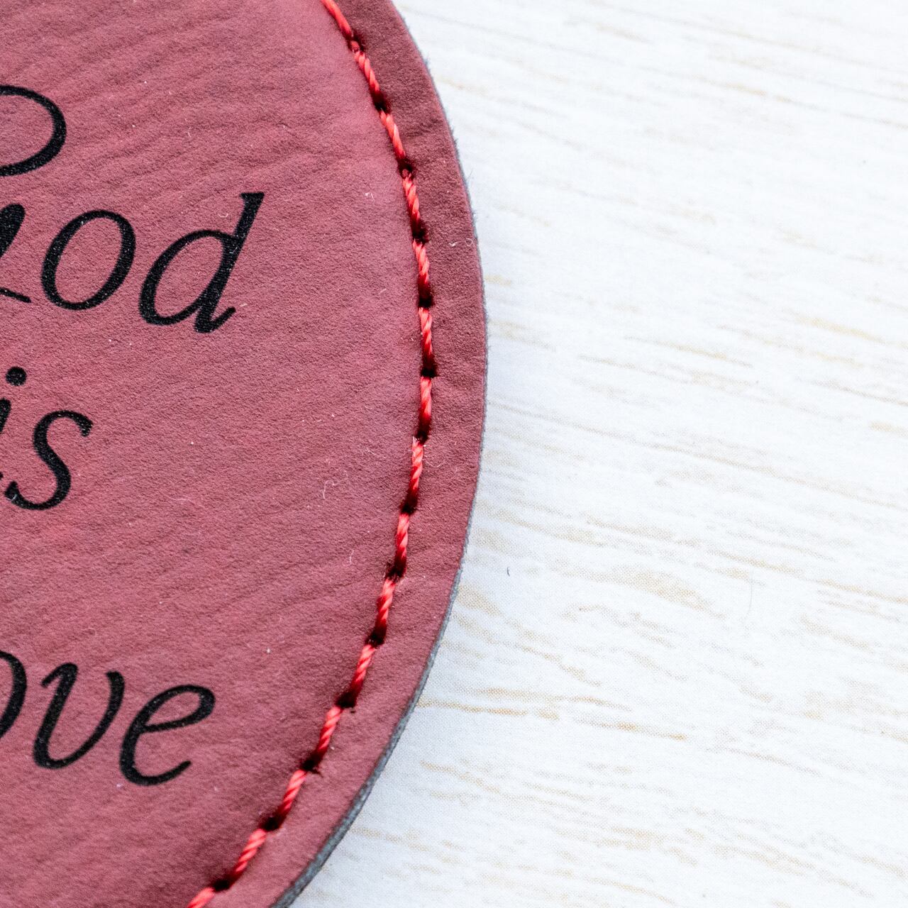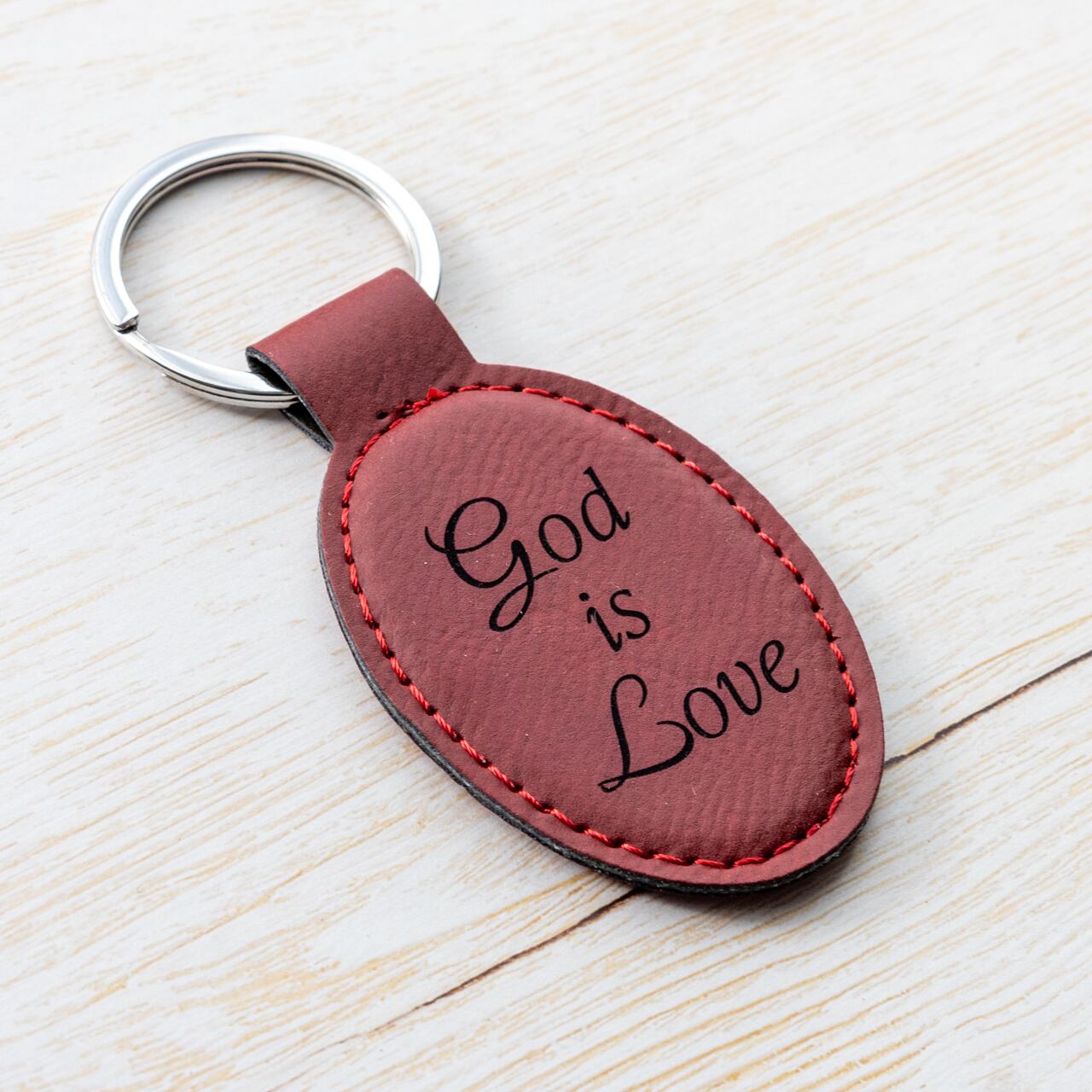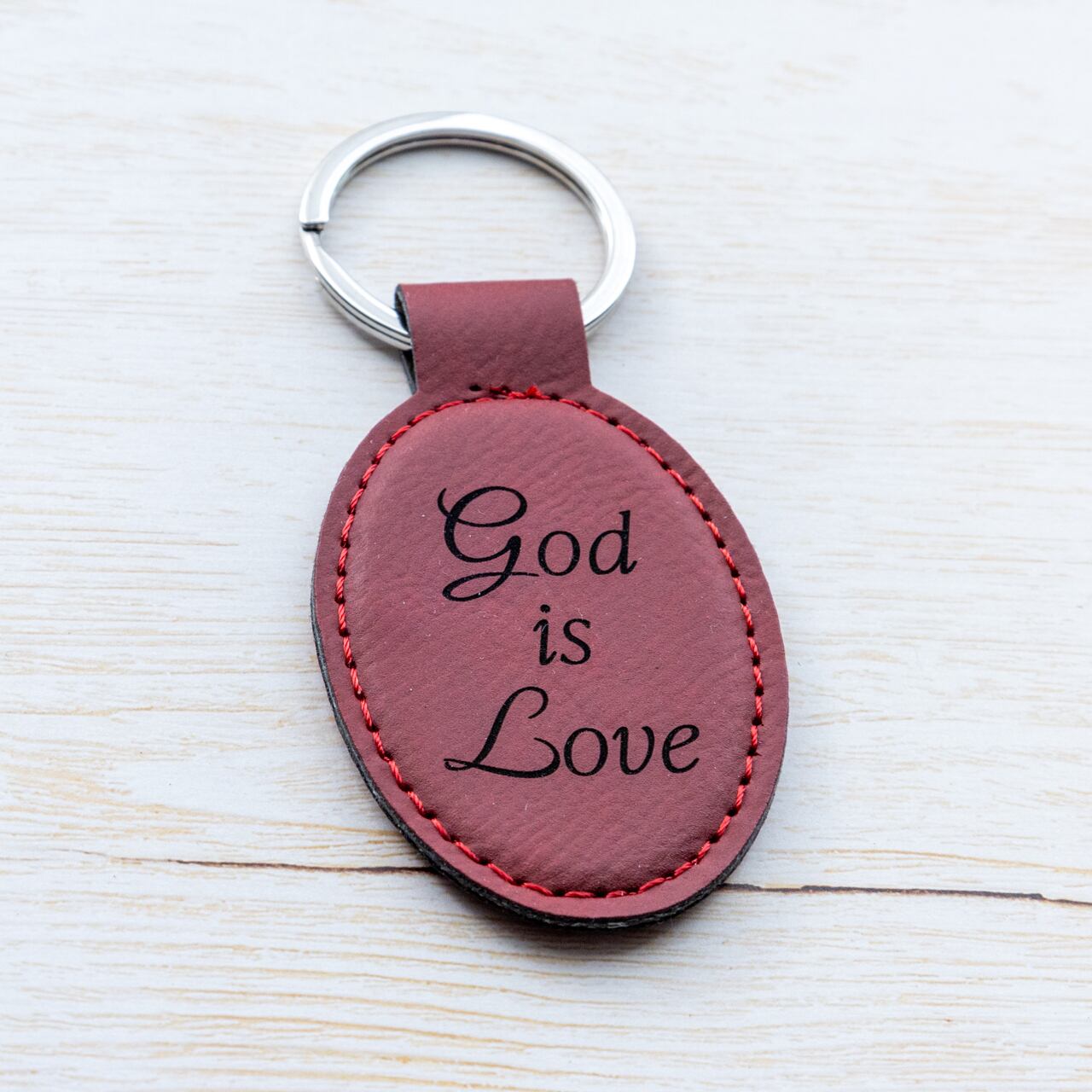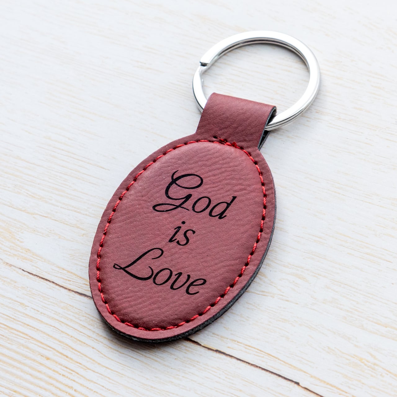 ローズカラーのシンセティックレザーキーホルダーに、第一ヨハネ4:16のみことばをロゴタイプ風に彫刻しました。