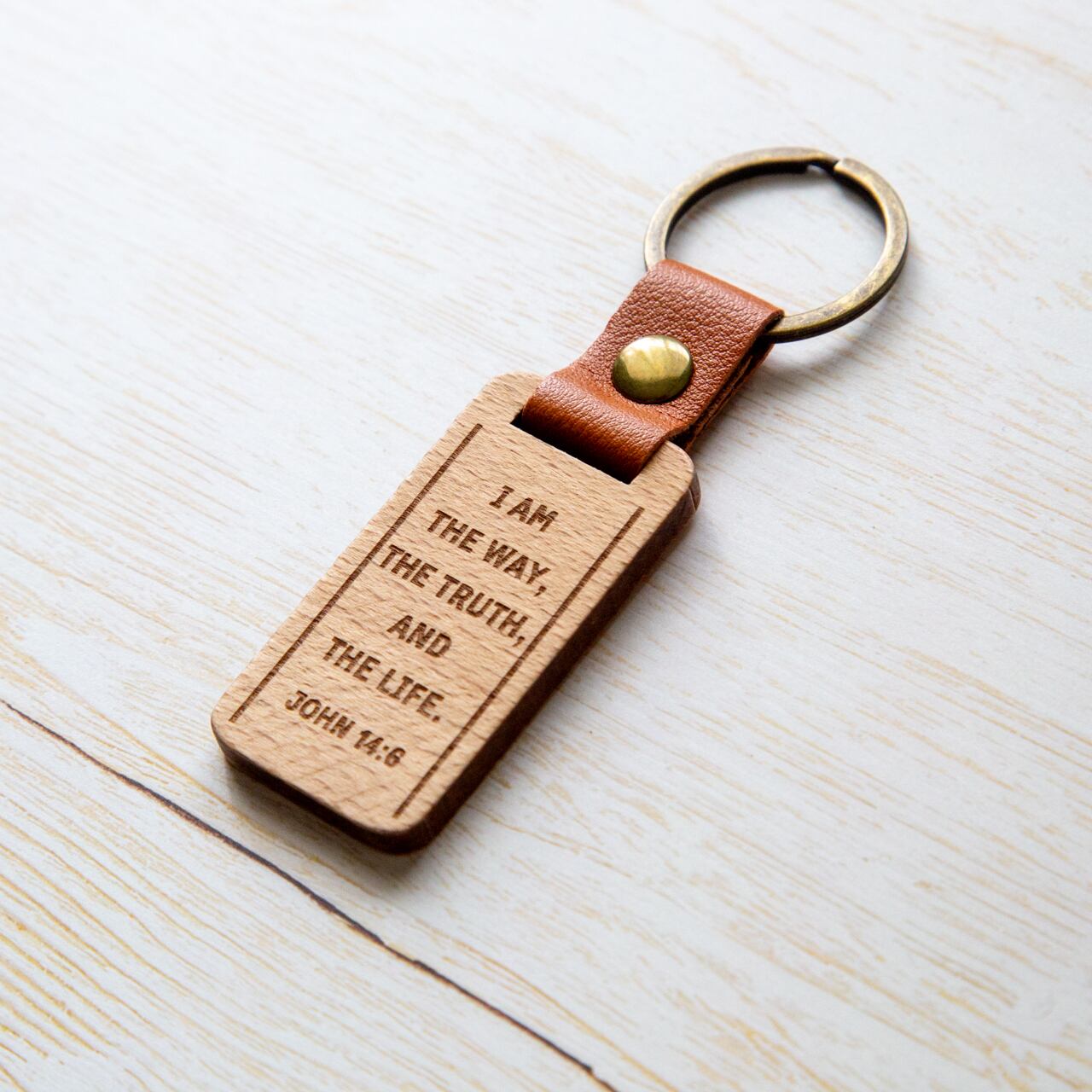 ウッドとレザーを組み合わせたキーホルダーのウッド部分に、ヨハネ14:6の英語訳と道をモチーフにした線をレーザー彫刻で刻印しました。