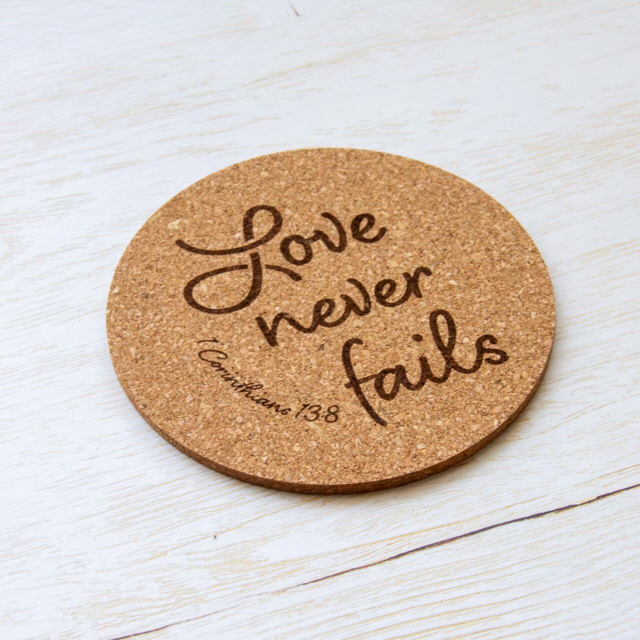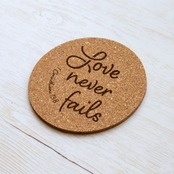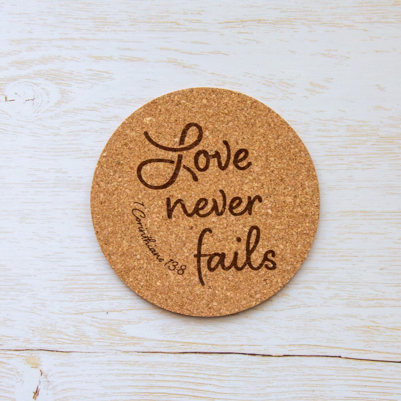 円形のコルクコースターに、第一コリント13:8の英語訳をロゴタイプ風に彫刻しました。