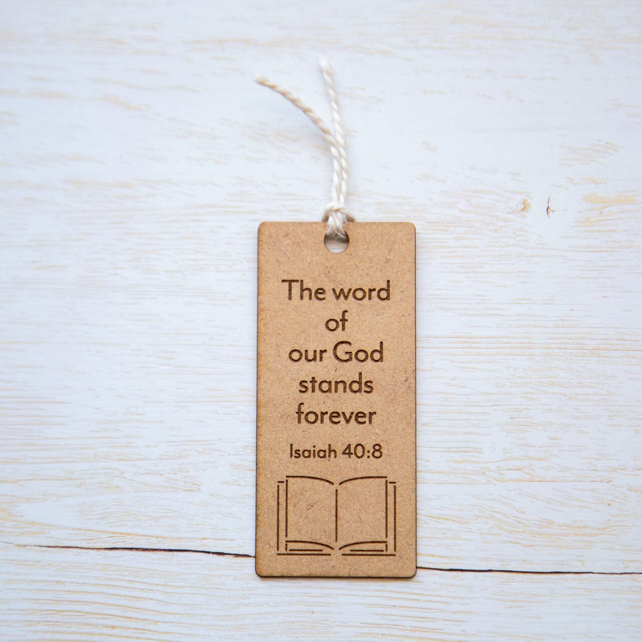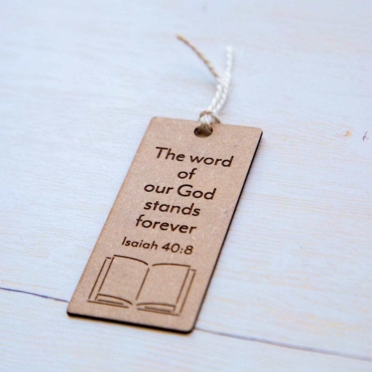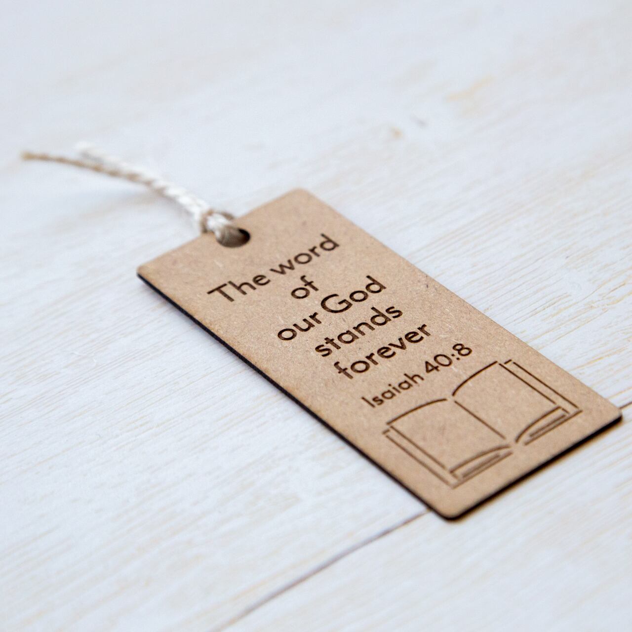 厚さ1mmのMDF板をカットし、イザヤ40:8のみことばの英訳と本のイラストを彫刻しました。