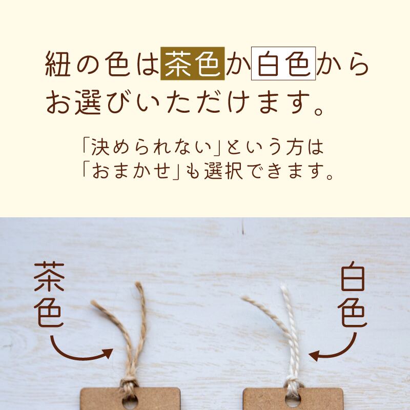 紐を通す輪の部分には麻紐をおつけしています。麻紐は茶色と白色の2種類からお選びいただけます。どちらかお好きな方をお選びください。
