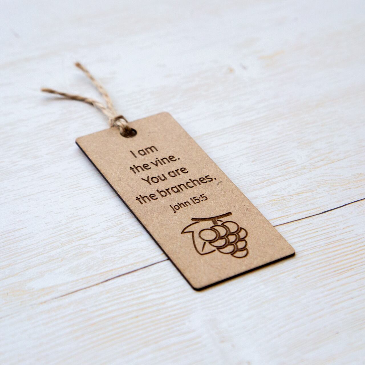 厚さ1mmのMDF板をカットし、ヨハネ15:5のみことばの英訳とぶどうのイラストを彫刻しました。